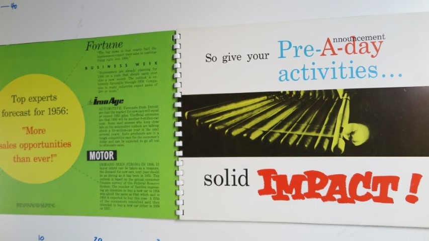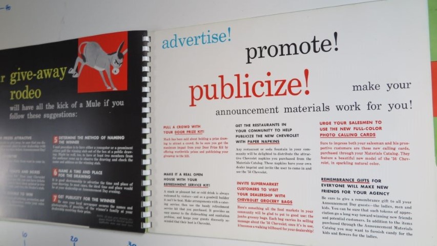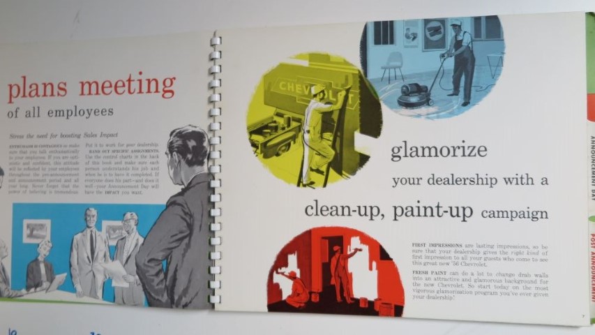 50er Jahrgang Händler Utensilien Händlerbuch 1956 Chevrolet Händler Tipps „sell with impact“. GM macht Vorgaben, wie die neuen Modelle am besten an die Kunden heran getragen werden. Einzigartiges und seltenes Exemplar. 35x25cm Ringordner Stabile Seiten 6 Jahren ago 1956 Chevrolet sell with impact1956 Chevrolet Verkauf Tipps von GM Continue Reading Previous 1956 Chevrolet kleines Händlerbuch. Technische AngabenNext 1956 Chevrolet Händler Info, die vor dem Erscheinen der neuen Modelle an die Verkaufsstellen verschickt wurde. Dieser Set beinhaltet 3 Schallplatten, Filmrollen und Prospekt Material. Der Originale Projektor ist nicht dabei. Hab aber ein neueres Modell im Angebot. 110V mit Trafo